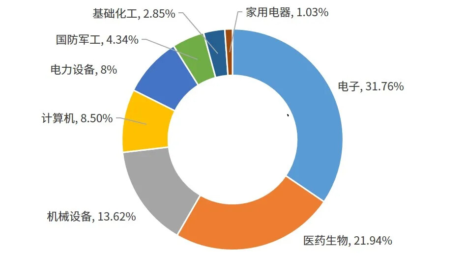 在行业结构上,目前科创200的前三大行业分别为电子(31.76%)、医药生物(21.94%)与机械设备(13.62%),权重合计占比67.32%;若再加上计算机(8.50%)与电力设备(8.00%),前五大行业合计占比为83.82%。