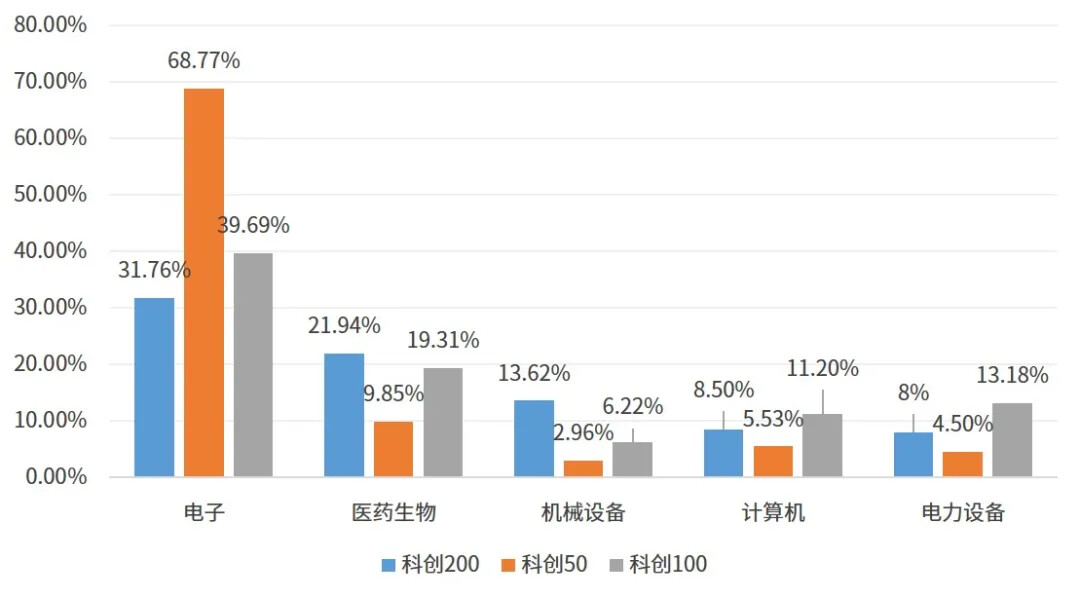 相比之下,科创50与科创100则显得更为集中,尤其是科创50,权重明显集中在电子板块(其中绝大部分是半导体),占比接近69%。