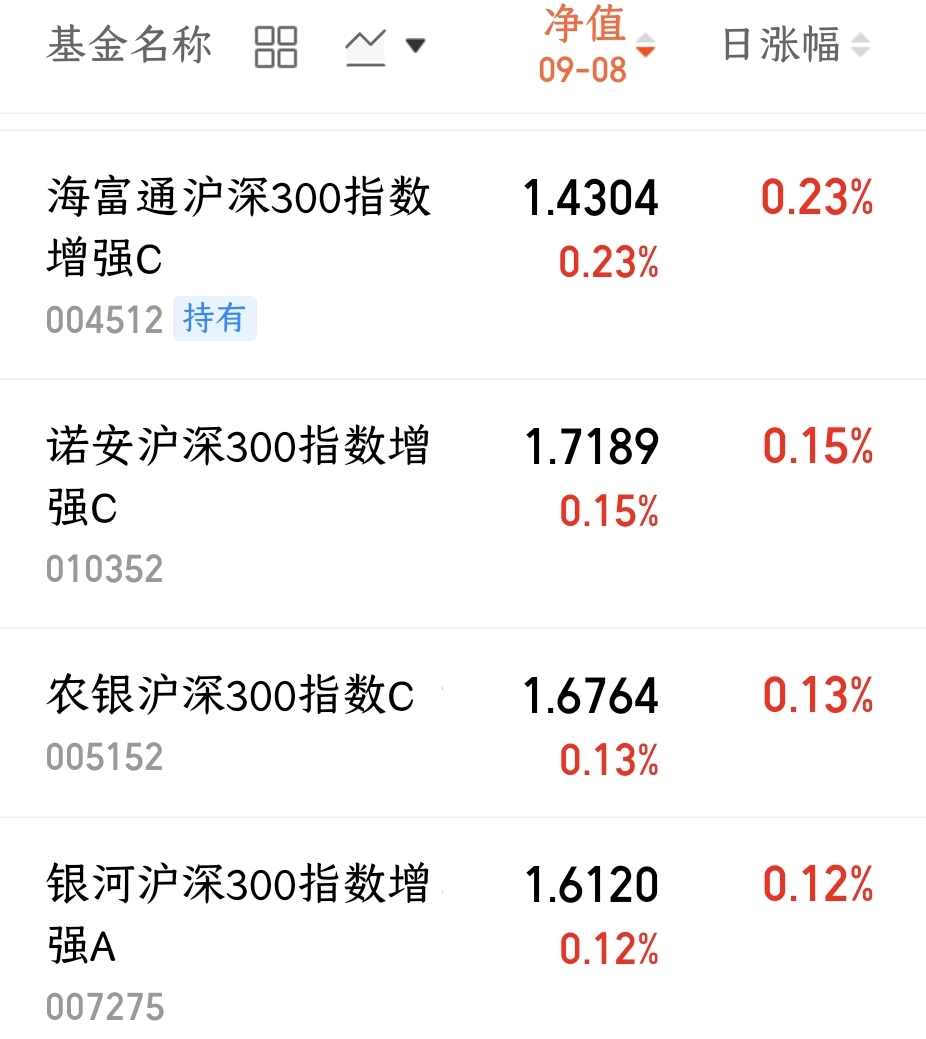今天股市震荡,行情有所分化,沪深300指数还好,收正了。我持有的$海富通沪深300指数增强C(OTCFUND|004512)$今日上涨了0.23%,而沪深300只涨了0.16%,该基比沪深300指数涨的多,有超额收益。