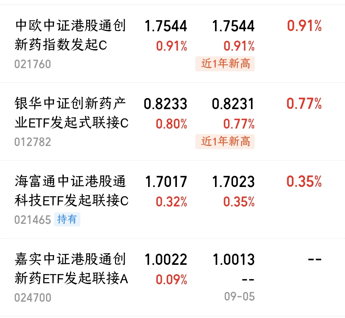$中欧中证港股通创新药指数发起C(OTCFUND|021760)$今日上涨了0.91%