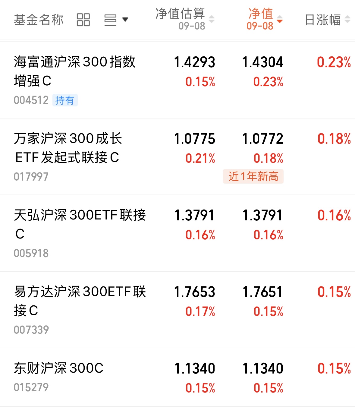 沪指稳稳收红了,$海富通沪深300指数增强C(OTCFUND|004512)$继续超额表现!收涨0.23%,相当优秀啦!这个我持有收益率9.58%,拿了时间比较长了,中间还加仓了一次,继续持有!
