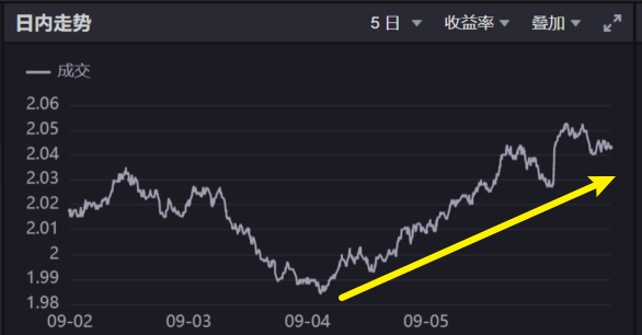 适度拉长来看,下图,9月4日上午,也就是上周四股市大跌期间,30年国债下破2%之后,近期持续震荡上行,2天时间,从最低点,已经上行超过5bps——部分基金经理,在周四股市大跌的时候,认为股债迎来情绪切换的机会,可能也有加仓。