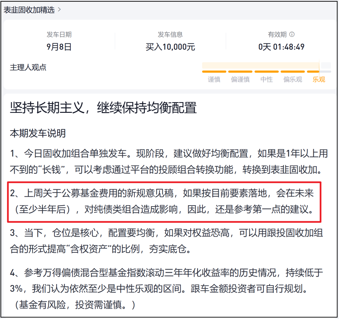 下图,从主理人的发车理由中可以看到,一方面,是继续引导大家做好均衡配置,部分可以长期不用的,投资于纯债类产品的资金,可以选择跟投到固收加组合中来;