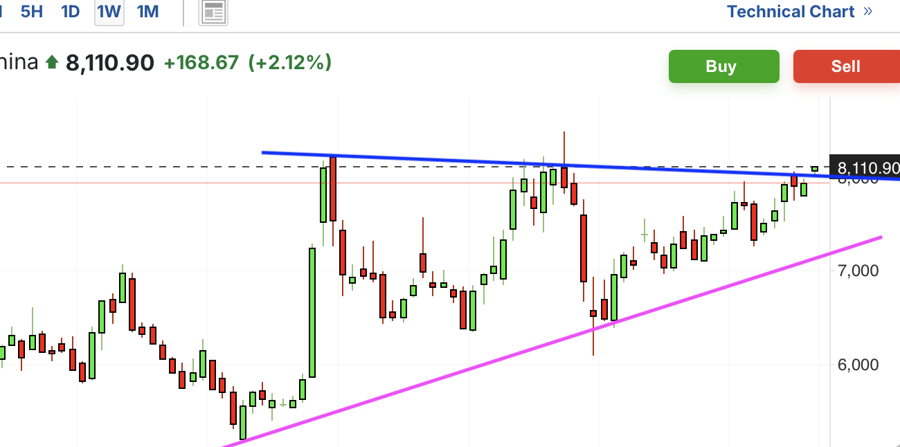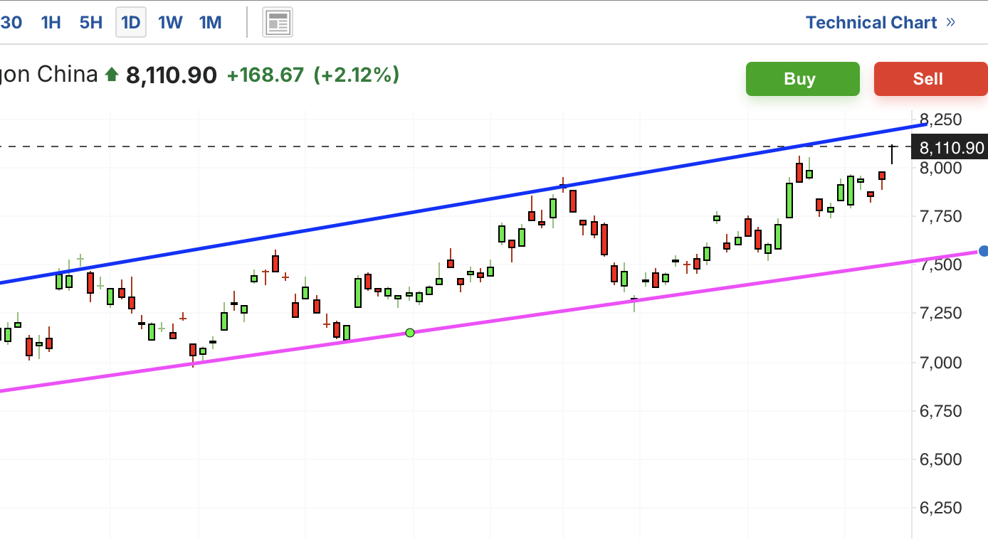 中概股近期反转向上,后受阻于下跌趋势线,周一较大幅度反弹,突破压力位,目前仍处于压力位区域,上方还有另一压力位。从短期看,它进入上升通道,目前已经逼近通道压力位。