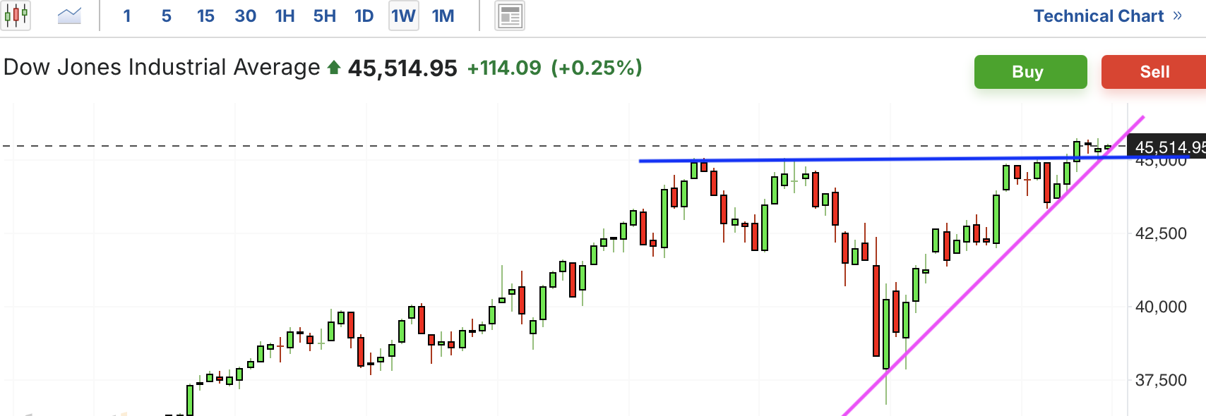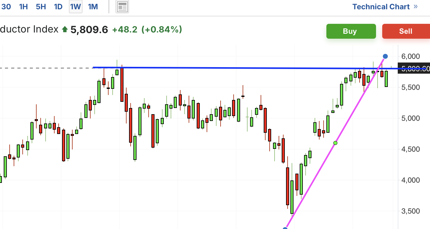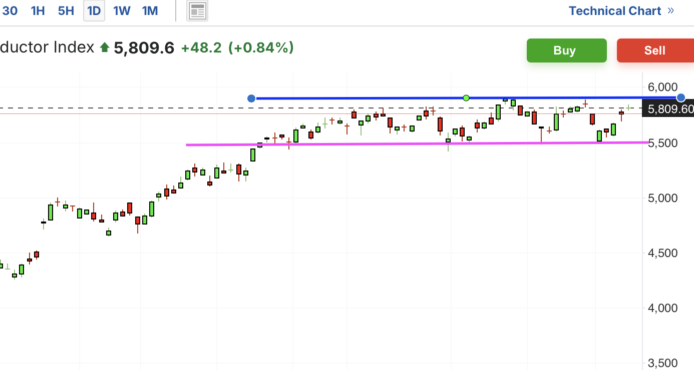 费城半导体在最高点受阻,跌破上涨趋势线,进入箱体横盘趋势。最近几日从关键支撑位反弹,已经逐渐靠近压力位,突破才能有新的行情。