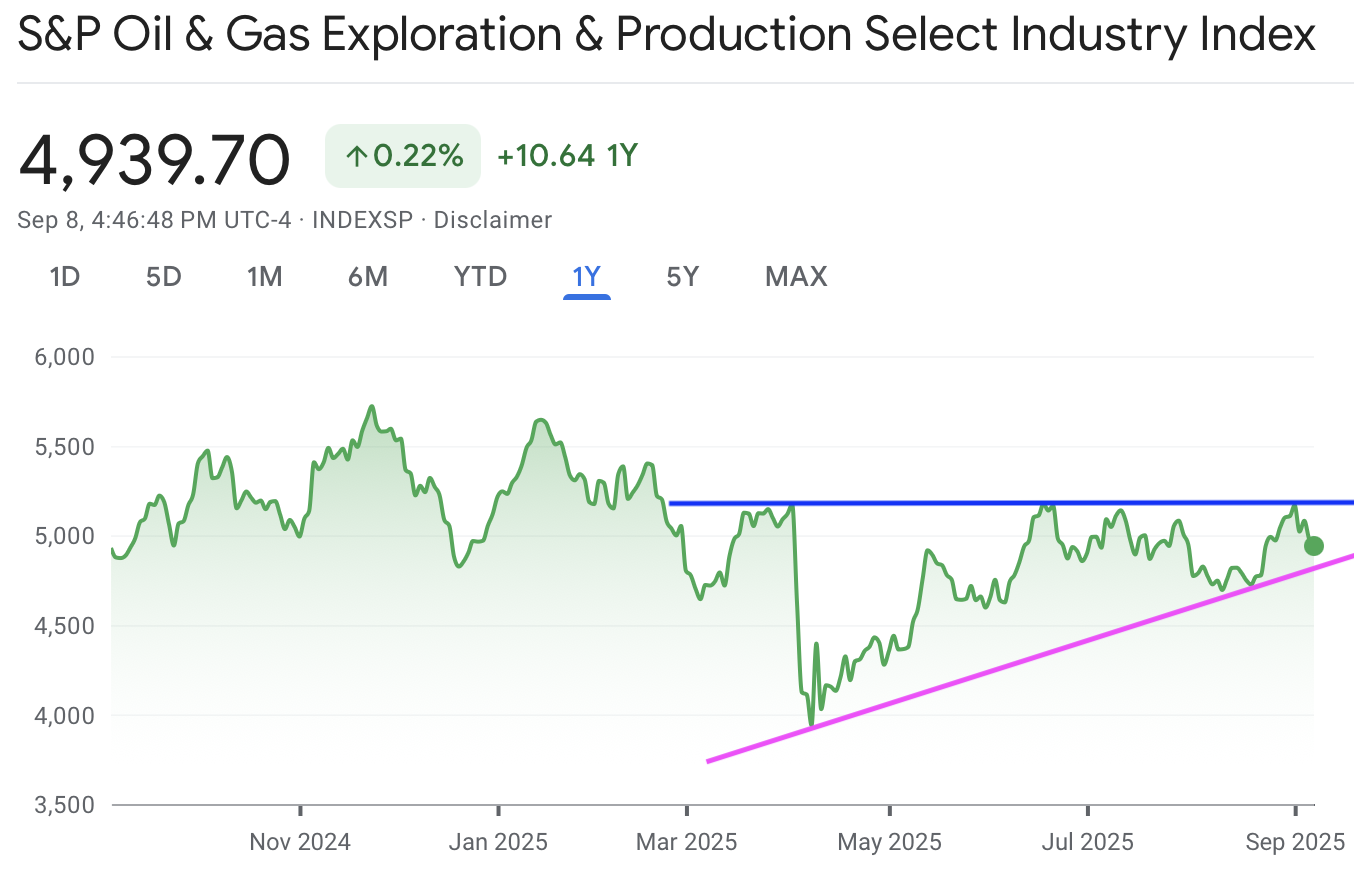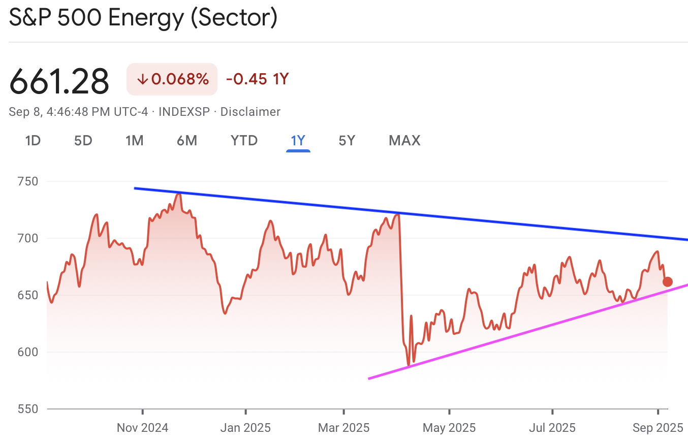 原油最近在前低支撑位横盘震荡,一直窄幅波动,前几日跌至支撑位,周一反弹,暂时守住支撑。能源和油气再次上行受阻并回落,已经靠近上涨趋势线,能否守住支撑决定后市走向。