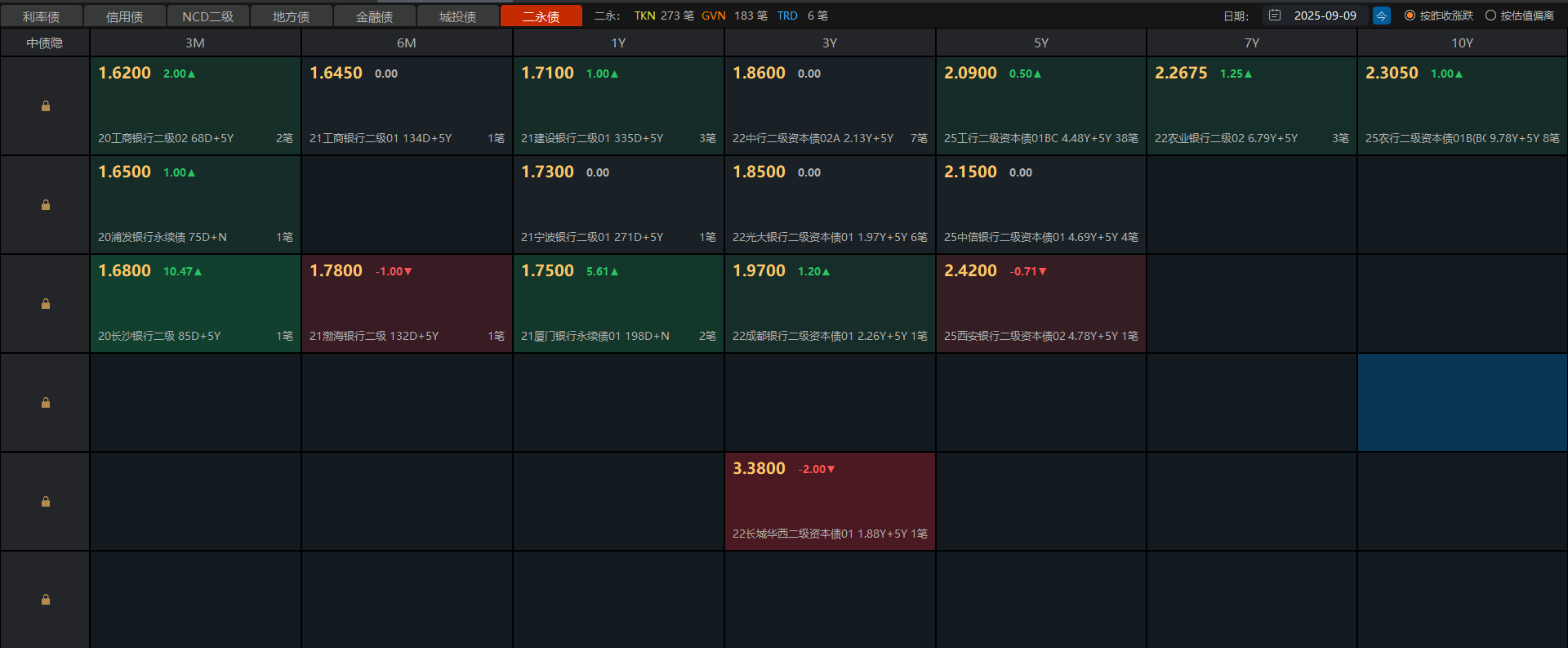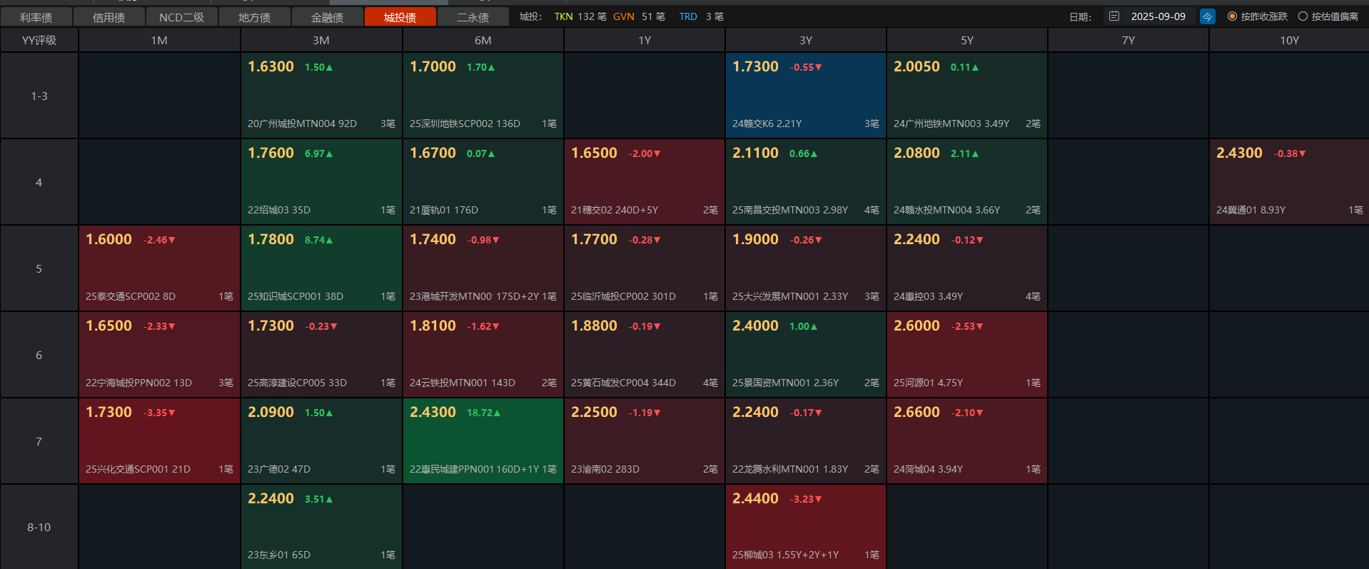 09月09日债市午间天气播报:上半场结束,股债双杀,不过港股和贵金属涨势较好(降息预期发酵)。隔壁盘内震荡幅度还是比较大,四千多家下跌。缩量观望的资金比较多,要看下午股市能不能放量拉升,债市也不敢有动作,基金全天处于卖出状态。利率债盘面显示红的,但7-10年国开债老券小绿2个左右,超长国债轻仓碎10个左右(华子),重仓碎蛋11+个。信用债中城投债相对好一些,小部分收0-1个蛋,其余小碎1-3个蛋。