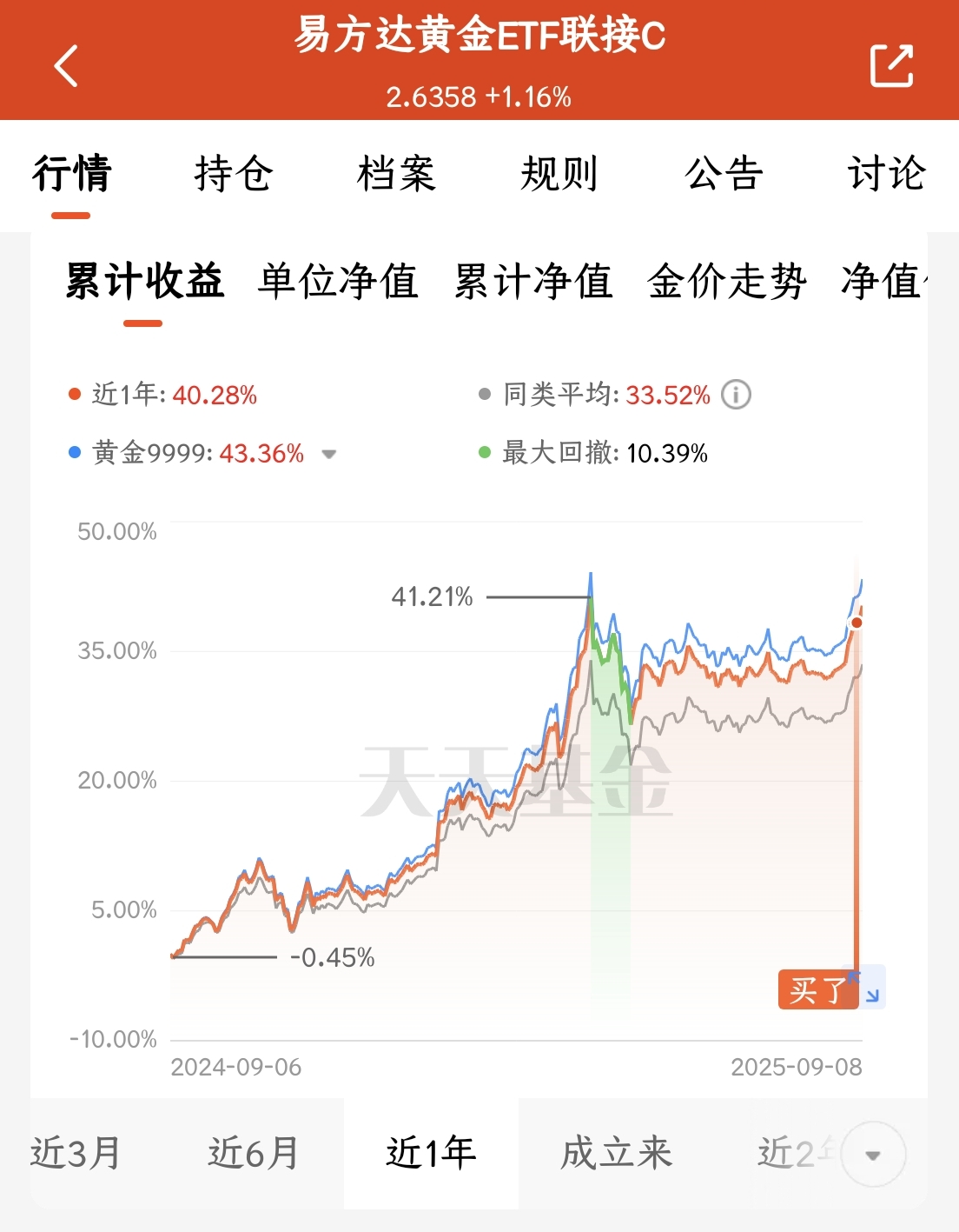 最近黄金涨势不错,是不是可以继续加仓了?美联储可能降息的消息让金价有支撑,中国央行也在持续增持黄金。现在全球局势不太稳定,黄金作为避险资产依然有吸引力。而且黄金走势相对独立,在资产配置中能起到分散风险的作用。我之前布局了一些$易方达黄金ETF联接C(OTCFUND|002963)$,要不要继续加仓呢?