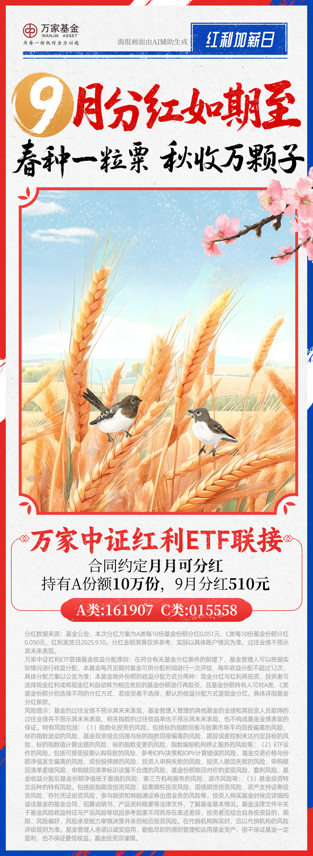 万家中证红利联接基金9月10日(本周三)发放分红,9月分红如期而至!