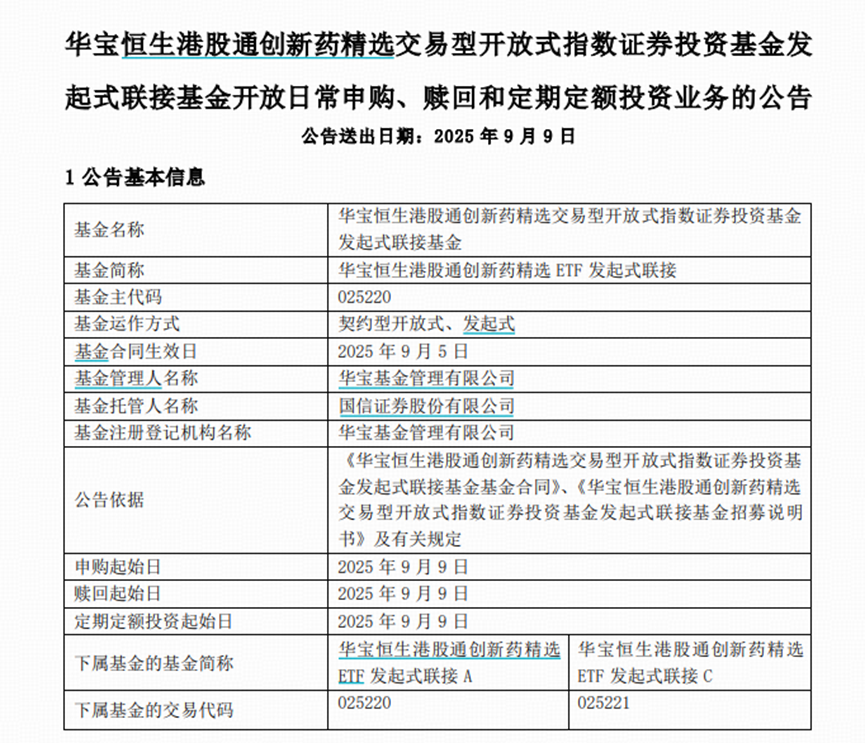 正巧,宝儿姐家的$华宝恒生港股通创新药精选ETF发起式联接A(OTCFUND|025220)$ $华宝恒生港股通创新药精选ETF发起式联接C(OTCFUND|025221)$,9月9日正式开放申购啦!