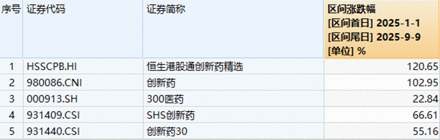 除此之外,恒生港股通创新药精选指数弹性也十分突出。截至2025年9月9日,其年内累计涨幅达120.65%,领涨一众创新药指数。