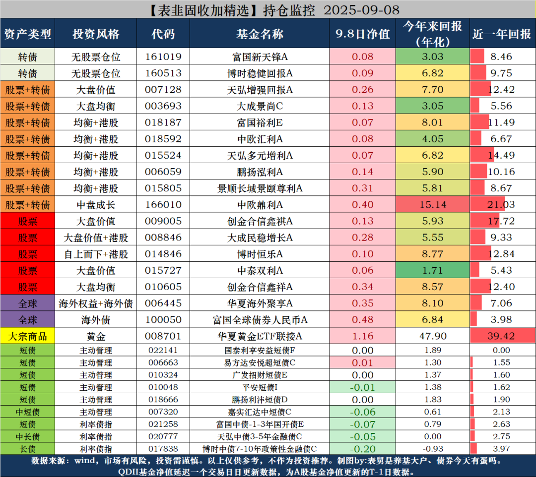 可以看到,表韭固收加,前期减仓了部分的一级债基,如果想要中低波的产品,直接看一些,股票仓位中枢10个点附近的产品就好了,比如表韭固收加里的大成景尚C 003693,这种,虽然弹性不大,但是回撤控制的非常好,股票部分又是大盘均衡风格,适合做些底仓,特别是现阶段,替换一些一级债基的仓位。