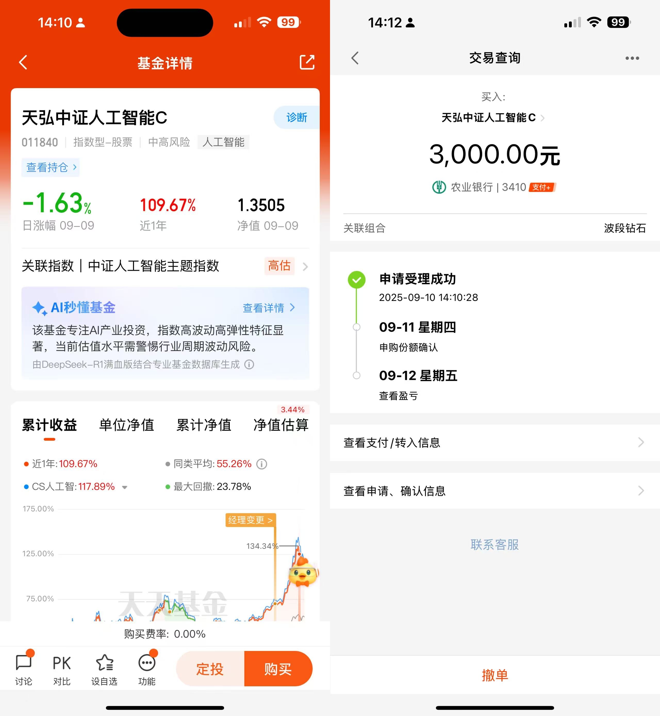 操作:顺势加仓3000元$天弘中证人工智能C(OTCFUND|011840)$基金,这只基金跟综合中证人工指数指数,覆盖了AI产业链的基础层、技术层和应用层,比较全面地打包了国内AI领域的核心企业,例如持仓里面的寒武纪是国产芯片的代表,中际旭创和新易盛是光模块全球领先企业,科大讯飞和金山办公则是应用层的典型,这些公司基本都是AI各细分领域的龙头,所以该基金的弹性高,最近1年涨幅高达109.67%,远远超过同类平均55.26%,在同类中表现非常优秀。