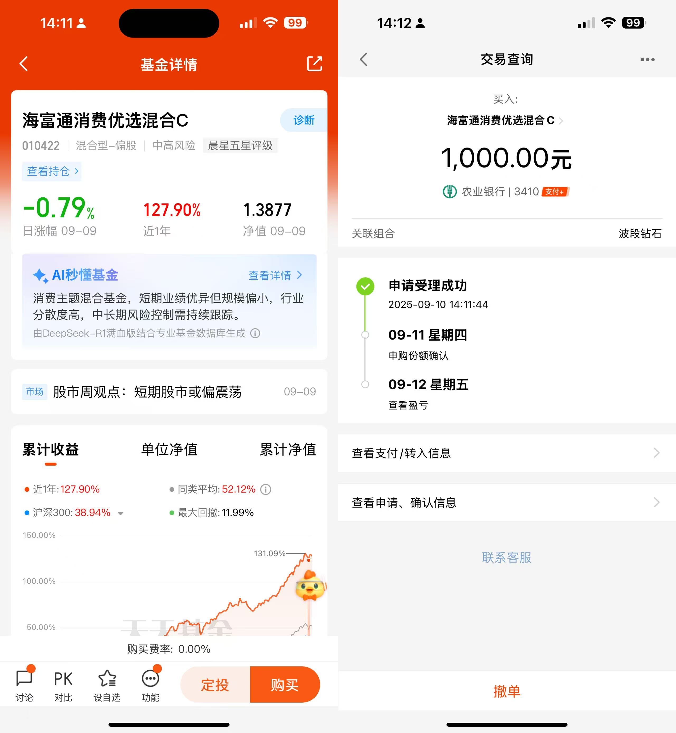 操作:低吸上车1000元$海富通消费优选混合C(OTCFUND|010422)$基金,该基金重点布局新消费+传统消费升级赛道,既有白酒、酒店等传统消费压舱石,也有预制菜、智能家电等新消费弹性,符合“消费升级+技术革命”趋势。近年来《提振消费专项行动方案》推动数字零售、智能家居等新消费,补贴政策落地直接利好重仓股。