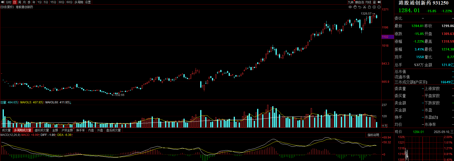 港股通创新药震荡走低,指数超跌1.5%,日线再次回踩5日均线的支撑,短期继续关注5日均线的支撑,只要这个支撑还在,短期就可以继续格局。