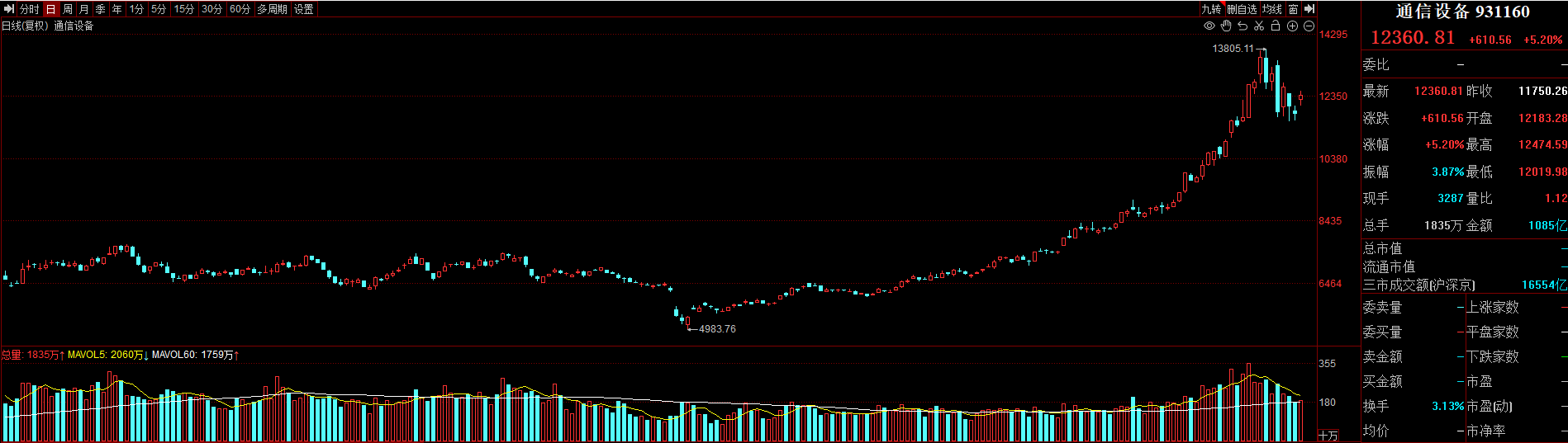 通信设备终于反弹了,指数高开高走涨超5%,日K线已经成功的站上5日均线的支撑,下方还有20日均线作为防守,短期行情有望继续震荡反弹,当下我会继续格局。
