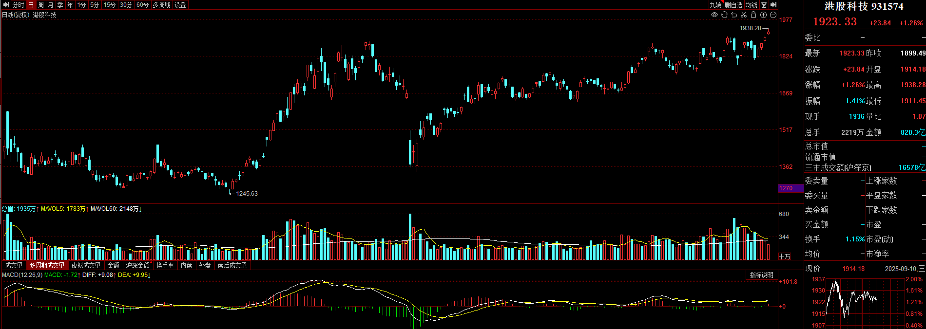 在我的坚持下,港股科技终于走出了箱体的压力位,今日港股科技指数高开高走,指数涨超1%,技术面上已经出现了多头趋势,当下可以顺势做加法,也可以继续格局。