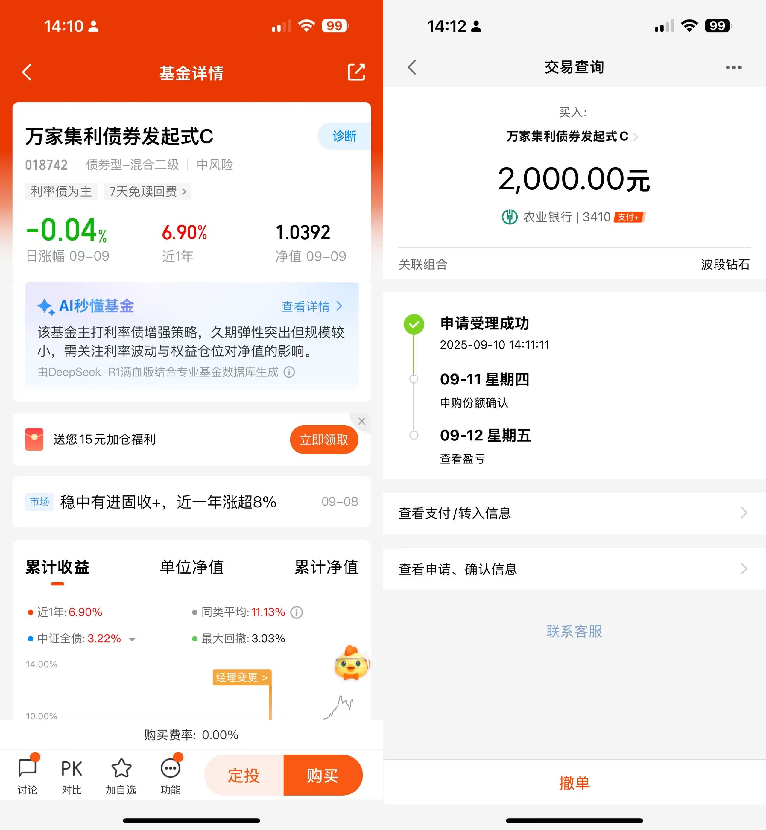 操作:顺势上车2000元$万家集利债券发起式C(OTCFUND|018742)$基金,这是一只中风险的混合型债券,今年牛市以来,有很多新手入市,新手直接去买股票,买权益资产是很容易受伤的,所有新入市的朋友不妨关注一下混合债券,万家集利债券基金含有85.52%的债券,其中主要是利率债为主,这部分资产主要是做防守用的;另外还有9.43%的股票,主要包含腾讯控股、香港交易所、长江电力等,覆盖互联网、金融、公用事业,可以有效的降低单一风险;最后这只基金还预留5.13%的现金应对赎回,流动性管理较谨慎。整体来看,这只混合债券基金退可守、进可守,最近1年涨幅6.9%,远远高于同期的中证全债指数,是新手参与投资市场的良配。