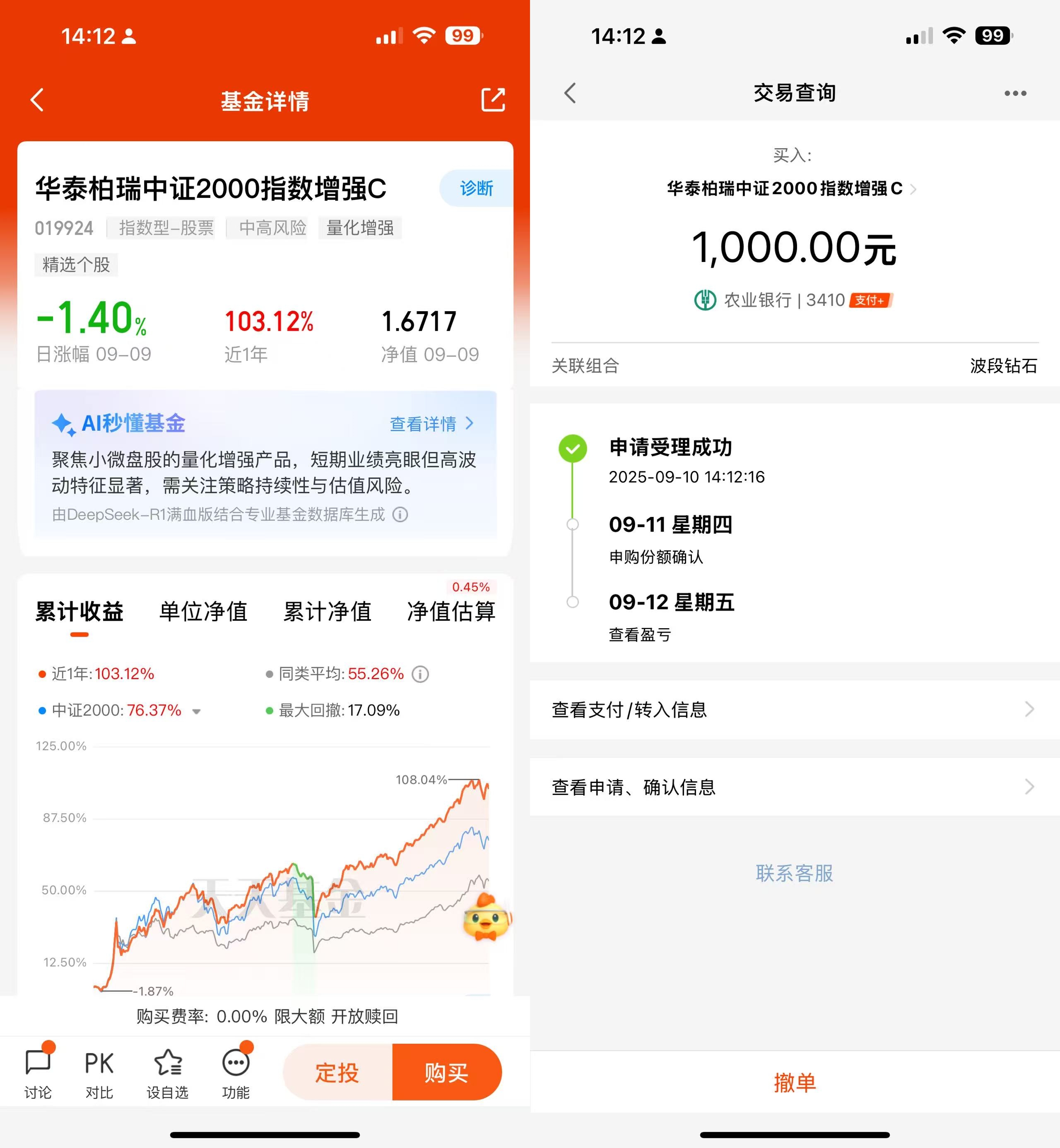 操作:顺势上车1000元$华泰柏瑞中证2000指数增强C(OTCFUND|019924)$基金,该基金采用指数增强策略跟踪中证2000指数,主要投资自由流通市值在20-50亿的小微盘股票,其中以科技成长+高端制造为主,该基金最近1年涨幅高达103.12%,远远超过同类平均55.26%,在同类里面表现优秀。