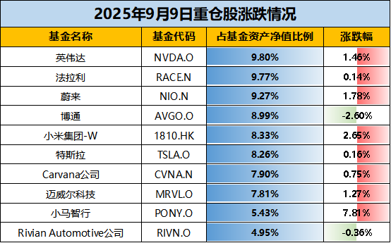 【十大持仓】根据最新披露的基金定期报告,截至2025年二季度末,华宝海外新能源汽车前十大重仓股包括英伟达、法拉利、蔚来、博通、小米集团-W、特斯拉、Carvana公司、迈威尔科技、小马智行、Rivian Automotive公司,占基金资产净值比例合计为80.51%。