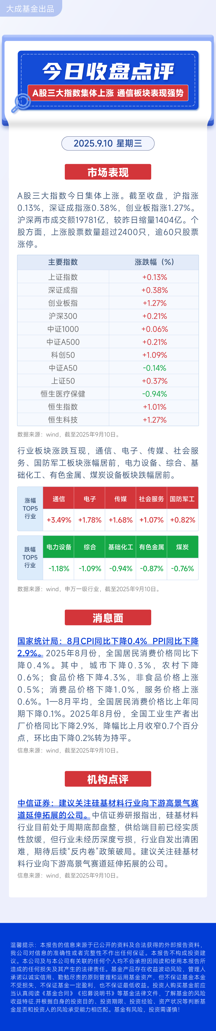 收盘点评:A股三大指数集体上涨,通信板块表现强势