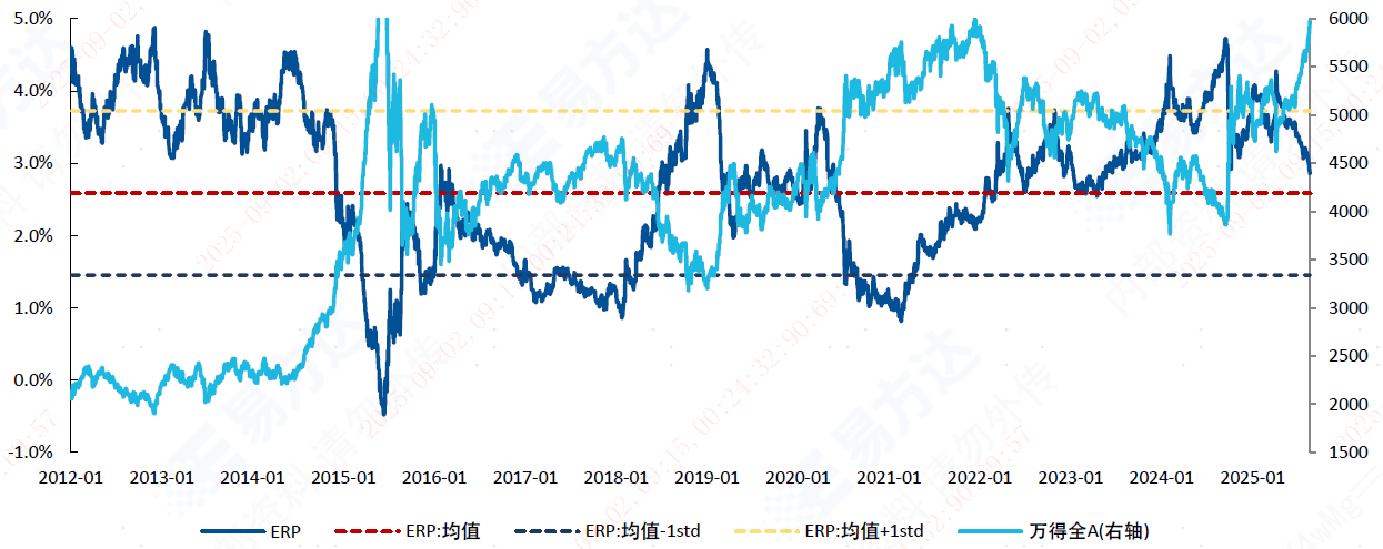 然后我们再来看看股债性价比。关注这个账号的老朋友可能还记得,我在2023年8月写过一篇文章《市场已经进入“至暗时刻”了吗?》,里面介绍过当时的股债收益差达到了一个历史低点,代表着股票资产的性价比很高。而从最新的市场数据来看,虽然万得全A指数持续上行,但目前的股债性价比(下图深蓝色线)还处在平均值水平,比2021年的大部分时间里要低。