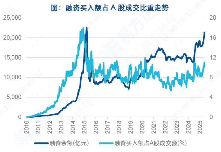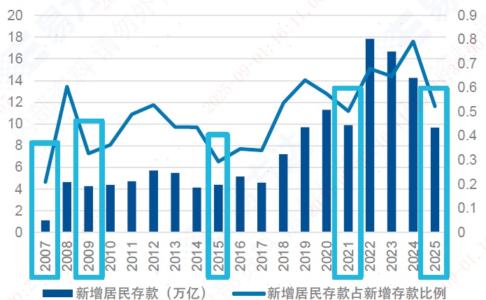 首先看下市场资金的情况。一般来说,市场的增量资金可以分为外资和内资,也可以分为机构和个人。近期观察到的第一个数据是:7月住户存款减少1.1万亿元,同比多减7800亿元;与此同时非银金融机构存款增加2.14万亿元,同比多增1.39万亿元,为2015年有记录以来同期最高。这说明最近有可能出现了“存款迁移”的现象,有部分个人投资者开始把资金从银行取出并投入到理财、保险、基金、股市并流入权益市场。