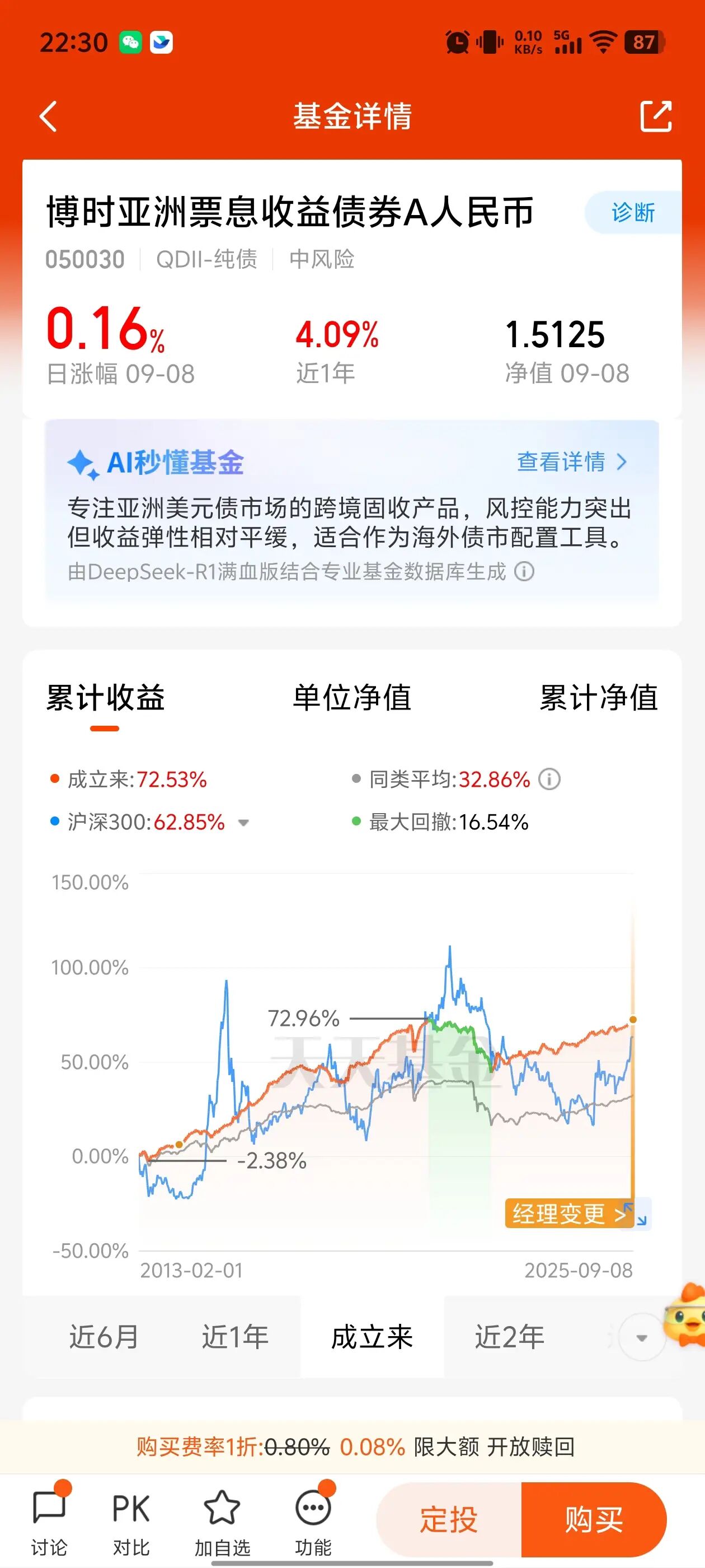 说到美债基金,我关注到这两天一个还比较有名的美债基金的基金经理发生了变更,就是博时亚洲票息。之前的基金经理何凯,有管理这只基金接近10年。并且这10年的业绩是非常不错的,净值表现比较平稳,尤其是经历了21-22年左右全市场的中资房地产美元债的爆雷危机,也迅速调整策略,带领基金净值迅速从这场债券风暴当中走出来。