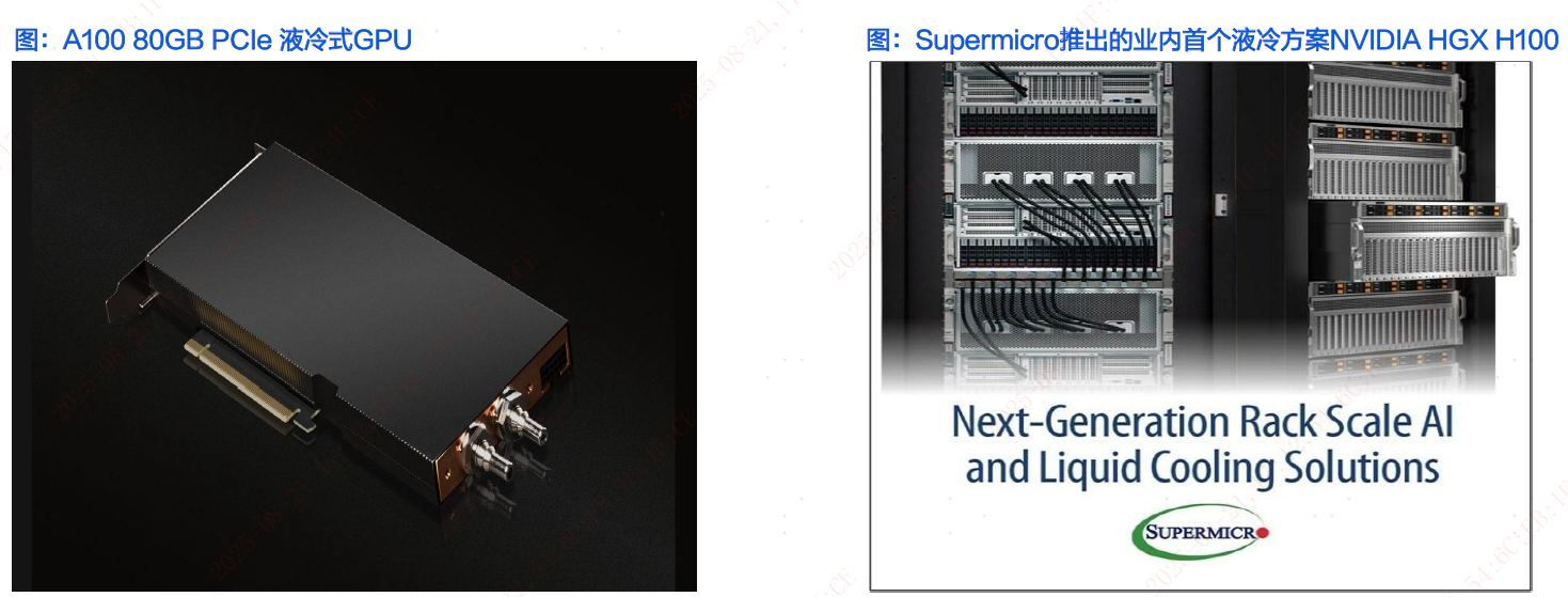 英伟达最早在2022年5月推出液冷GPU——A100 80GB PCIe液冷GPU,2023年5月,Supermicro推出业内首个NVIDIA HGX H100,提供高达80kW的直接芯片(D2C)冷却。