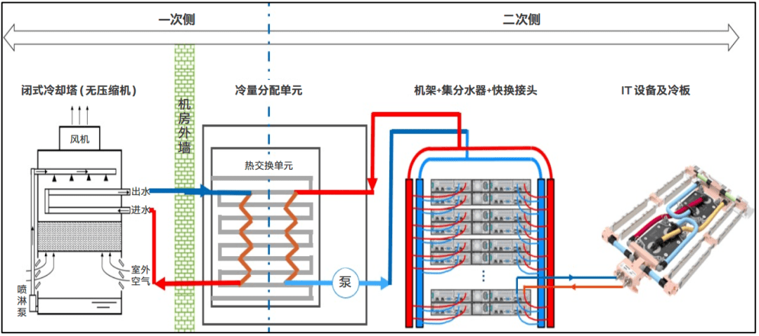 工作流程:冷却水在冷却塔或干冷器中被环境空气冷却→通过管道泵入室内的CDU(冷量分配单元)中的换热器→在换热器中吸收来自二次侧的热量后变热→再流回冷却塔降温,如此循环。