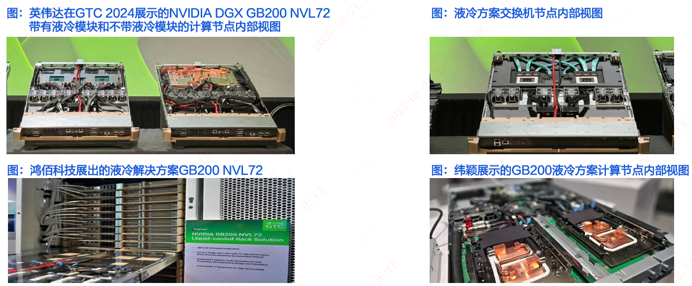 Blackwell性能激增,液冷方案成为必须。英伟达发布Blackwell时宣称,芯片在液冷服务器情况下测得的FP4精度算力能达到20petaflops。尽管英伟达并不强制要求使用液冷,但若想充分利用Blackwell芯片,液冷几乎成为必选项。英伟达、鸿海、广达等均在英伟达GTC 2024大会展出了自己的GB200液冷服务器和液冷机柜。