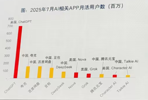 当前最具看点的全球前10大活跃用户AI相关APP,美国4家(图中红色),中国6家(图中黄色),考虑科研、人才、产业链、人口和资本等分布,未来的玩家大概率仍是中美两家,其他充其量是配角。