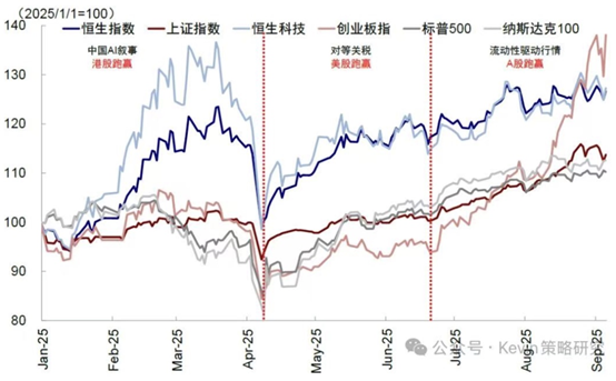 其一,今年年初港股明显跑赢A股,因此7月份至今的行情更多为“A股追赶港股”而非“A股领先港股”。其二,港股存在着业绩下修的预期。据中金公司统计,港股盈利增速相较2024年下滑且预期下修,这与A股的方向相反。具体地,上半年港股净利润同比为+4.2%,但相比24年的9.2%有所下滑;A股年报净利润同比+2.8%,但是是由24年的-3.0%扭负为正。因此,这一剪刀差造成了港股的阶段性弱势。