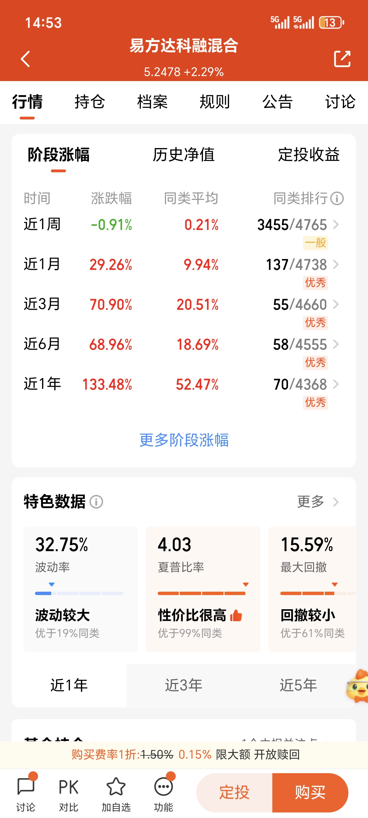 当前科技作为市场的主线,总是能带来爆发式的收益,今日又再次迎来大涨趋势,但相比于押注单一科技赛道,我更喜欢均衡布局,其中我比较看好$易方达科融混合(OTCFUND|006533)$这款基金不仅聚焦科技龙头企业,同时还覆盖了反内卷相关新能源,在当下备受政策大力支持,近一年涨超133.48%,远超同类平均52.47%,其中持有人机构占比超50%,也是表现了机构资金对其认可,我也准备上车一波,看好后期趋势!