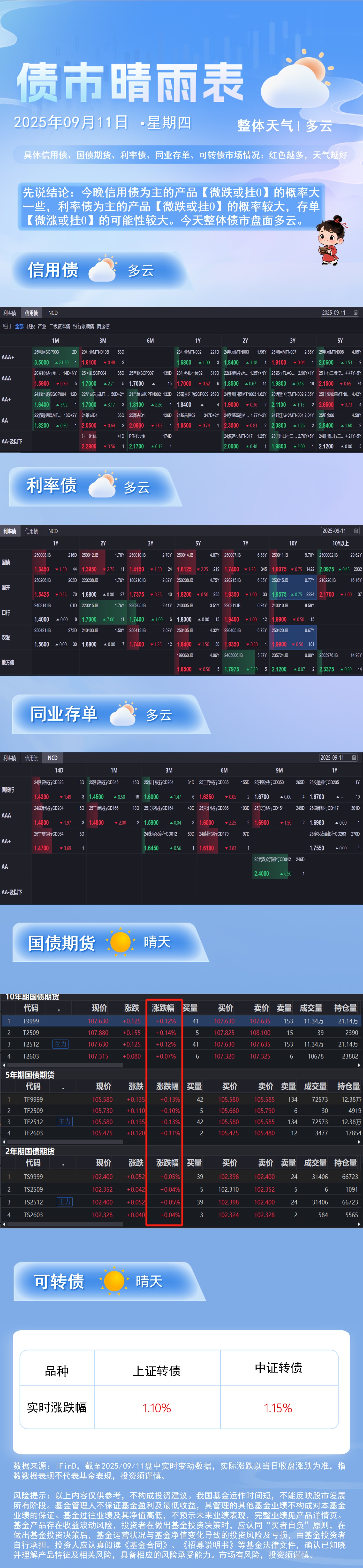 先说结论:今晚信用债为主的产品【微跌或挂0】的概率大一些,利率债为主的产品【微跌或挂0】的概率较大,存单【微涨或挂0】的可能性较大。今天整体债市盘面多云