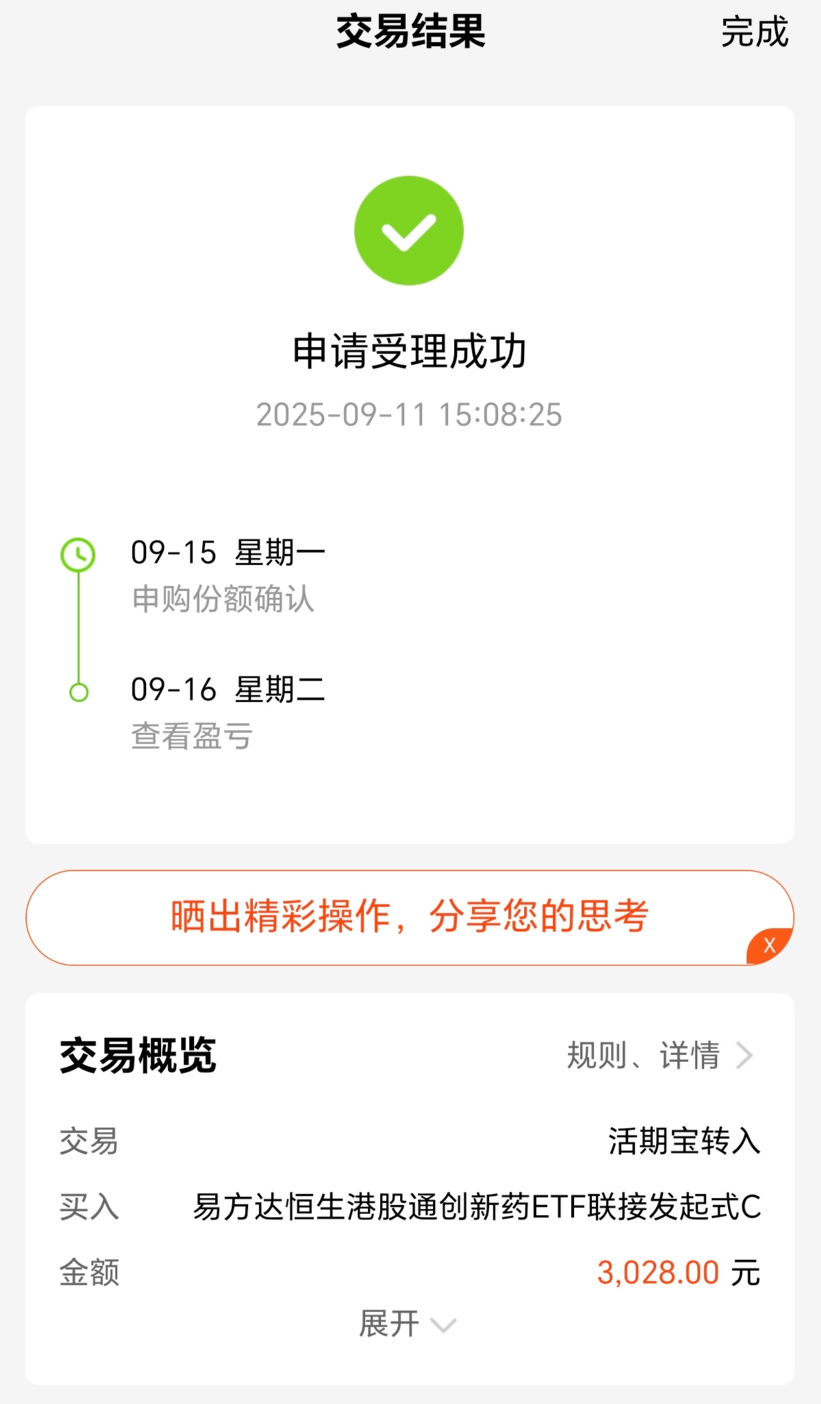今日三大指数集体上涨,整体表现非常火热,而我一直留意的创新药,虽然出现深度回调,但有时回调也是机会,我选择$易方达恒生港股通创新药ETF联接发起式C(OTCFUND|024329)$开始入手一波,这款基金是首批100%纯度的港股创新药,所以弹性空间会非常强,而现在大资金面仍然强势,中国创新药国际力量更不容忽视,虽然受到消息面的冲击导致暂时回调,但我认为其实也是加仓机会,期待创新药的反弹力量了啦!