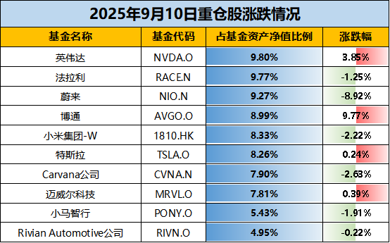 【十大持仓】根据最新披露的基金定期报告,截至2025年二季度末,华宝海外新能源汽车前十大重仓股包括英伟达、法拉利、蔚来、博通、小米集团-W、特斯拉、Carvana公司、迈威尔科技、小马智行、Rivian Automotive公司,占基金资产净值比例合计为80.51%。