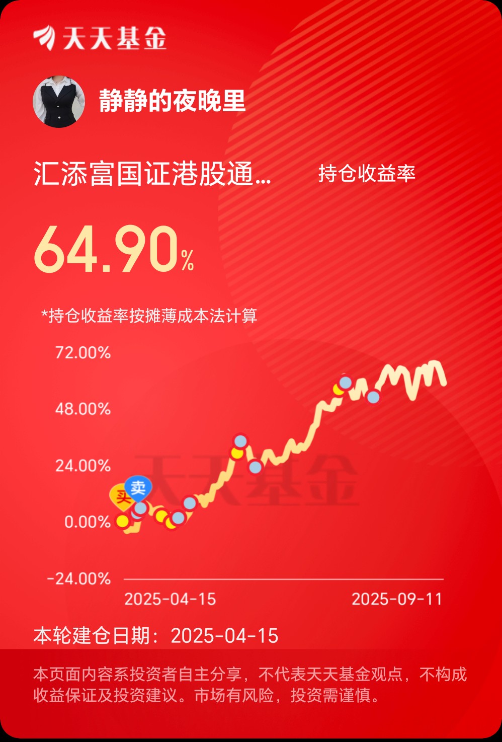 今日A股三大指数呈现震荡趋势,个股之间也更是分化不断,跌幅超3200家,而港股创新药却能如期反弹,看来昨日的利空消息,基本已经被消化完毕,同时经过适当调整,当前位置更加具有吸引力,所以我决定继续定投起来$汇添富国证港股通创新药ETF发起式联接C(OTCFUND|021031)$这款基金聚焦于港股创新药全产业链,其创新药含量高达100%,所以爆发能力很强!业绩方面更是表现出色亮眼,近6个月涨幅65.82%,近一年涨超107.08%,收益率远超同类平均水平,我的持有收益率也有64.9%!