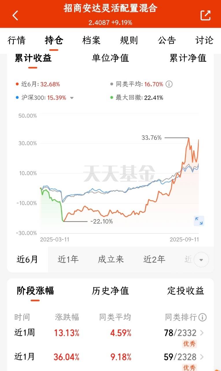 昨天CPO大涨,今天倒车接人啦!发现这只$招商安达灵活配置混合(OTCFUND|217020)$最近表现亮眼,基金经理提前布局CPO概念股,业绩相当能打,近一周上涨了13.13%,近一月上涨了36.04%,不仅远超同类均值,排名也比较靠前。小众但潜力大,持仓调整精准,值得关注。想找黑马基的朋友可以看看,说不定能挖到宝,我先上车了!