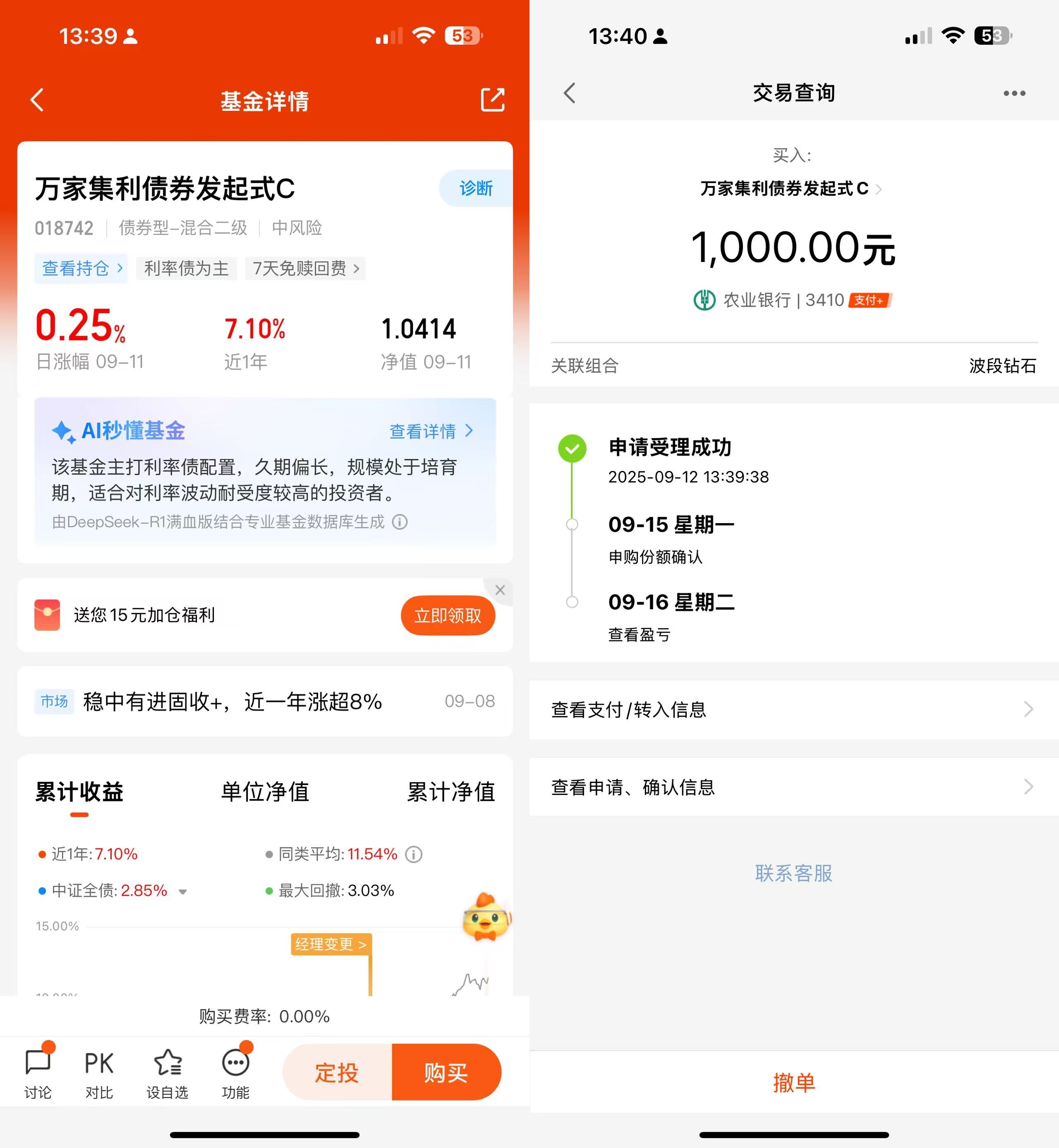 操作:低吸上车2000元$万家集利债券发起式C(OTCFUND|018742)$基金,该基金采用稳健为主的投资策略,资产配置上以债券为主,股票为辅。债券资产占比85.52%,主要是以利率债为主,股票资产占比9.43%,包括腾讯控股、香港交易所、理想汽车等港股和A股,当下牛市行情还在继续,配置权益类可以捕捉更高的超额收益。所以在整体上,这只混合债券可以做到退可守、进可攻的趋势。