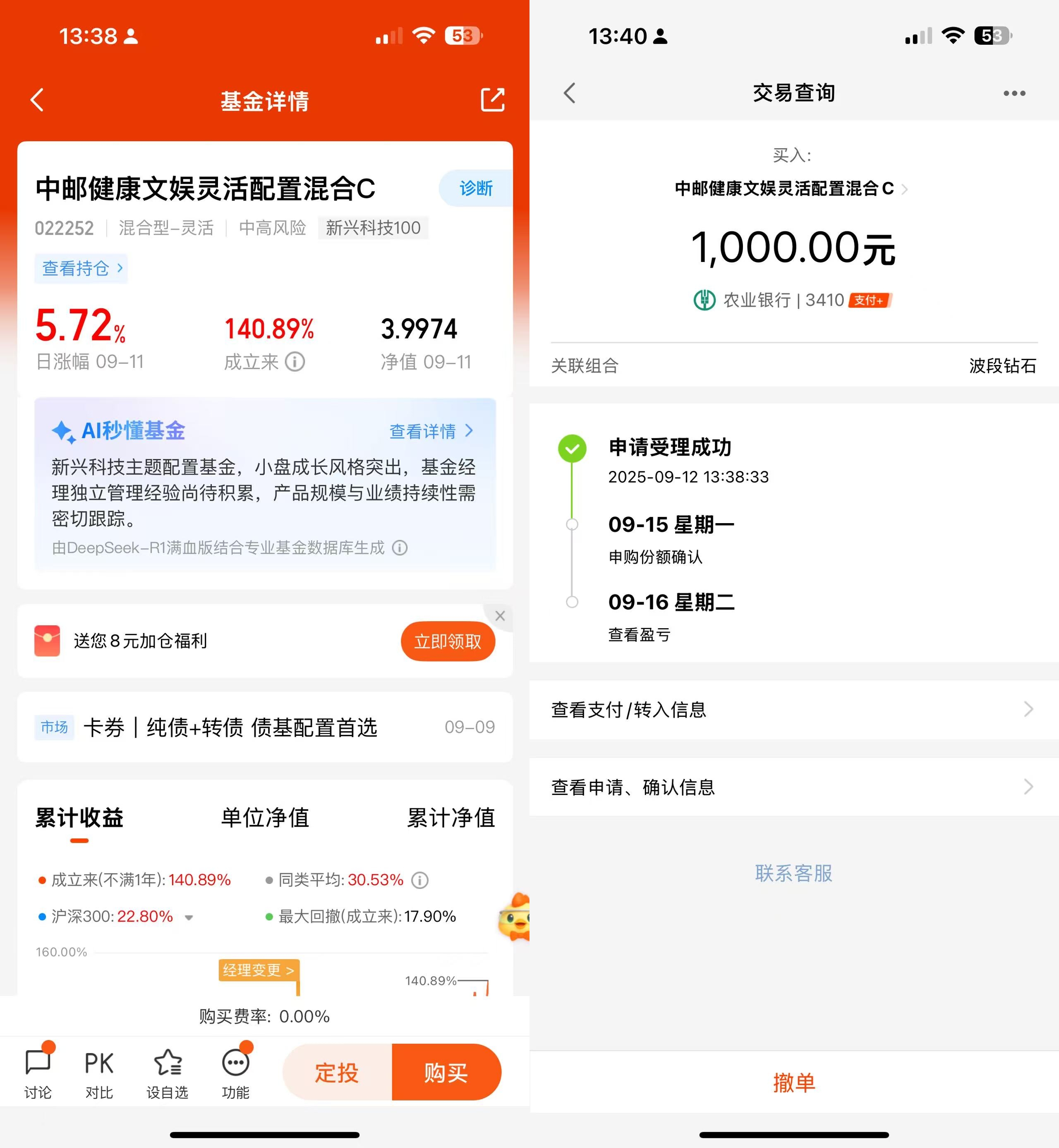 操作:顺势加仓1000元$中邮健康文娱灵活配置混合C(OTCFUND|022252)$该基金聚焦科技赛道,主要投资国内外算力,基金重仓的CPO方便,包含中际旭创、新易盛、天孚通信等;另外是PCB方向,包含胜宏科技、生益电子等,这些都是算力基础设施建设的科技龙头。随着算力技术不断演进,相关硬件需求持续升级,这也为该基金的发展提供了重要支撑。尽管该基金成立时间还不到1年,但累计涨幅已经高达140.89%,远远超过了同类平均30.53%,成立以来各个阶段的收益都表现很优秀,完美的演绎了基金经理对市场的把控能力。