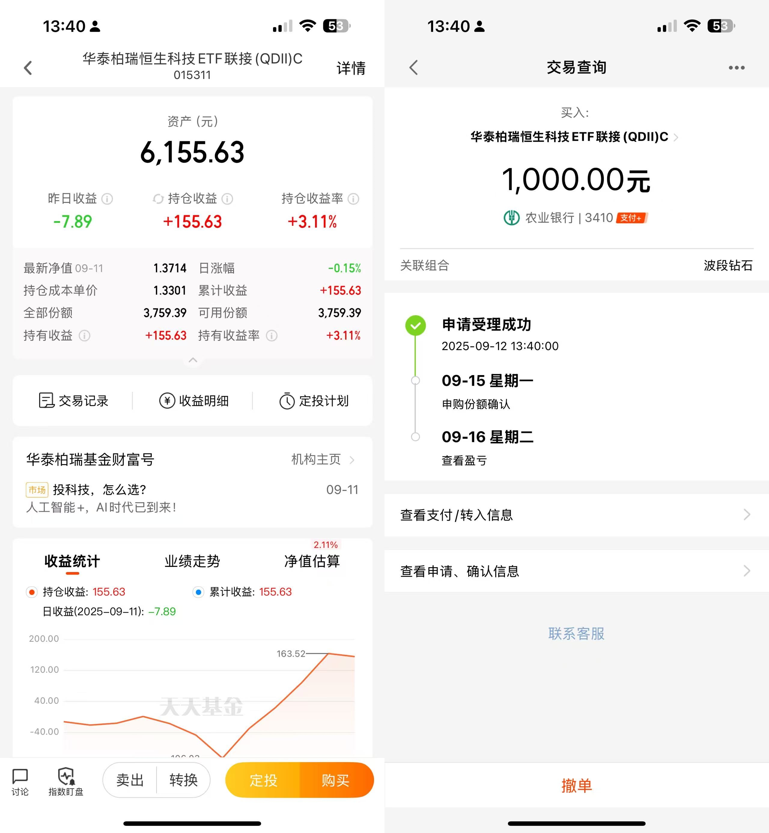 操作:顺势加仓1000元$华泰柏瑞恒生科技ETF联接(QDII)C(OTCFUND|015311)$基金,这只基金跟踪恒生科技指数,今年牛市以来,A股科技已经涨上天了,而港股恒生科技指数相对弱一些,但市场都是风水轮流转的,谁又知道下一个风口是不是恒生科技呢?当下美联储9月降息不断升温,这对于港股就是实打实的利好啊,而恒生科技指数是港股市场最具有吸金能力的指数,现在不买更待何时啊?