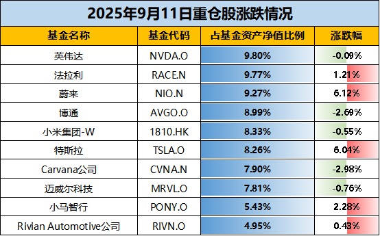【十大持仓】根据最新披露的基金定期报告,截至2025年二季度末,华宝海外新能源汽车前十大重仓股包括英伟达、法拉利、蔚来、博通、小米集团-W、特斯拉、Carvana公司、迈威尔科技、小马智行、Rivian Automotive公司,占基金资产净值比例合计为80.51%。