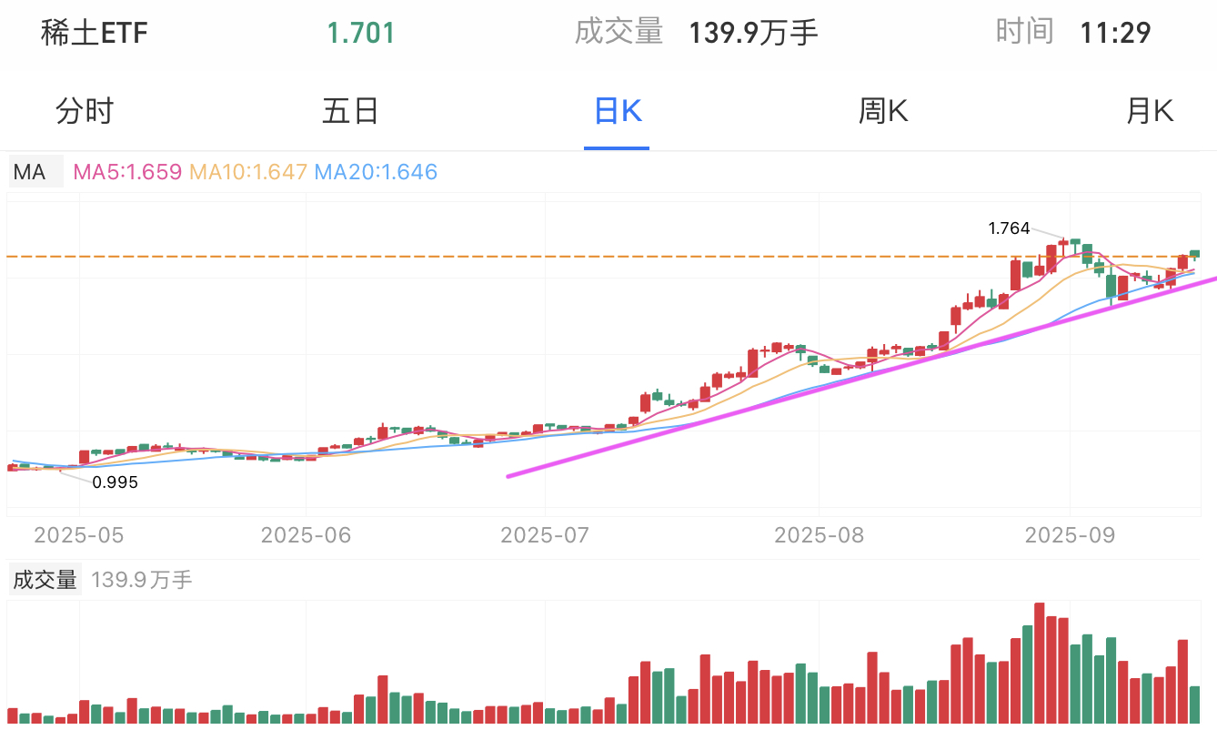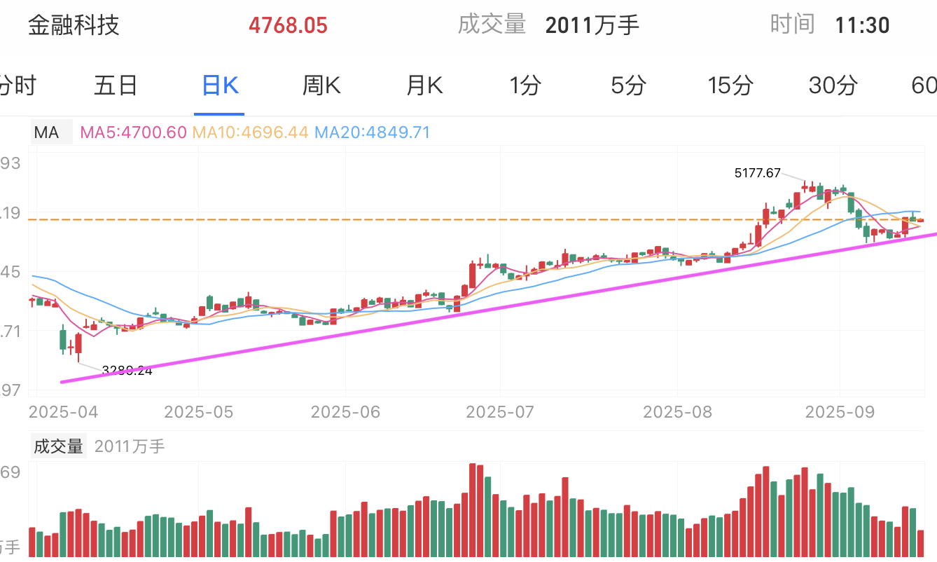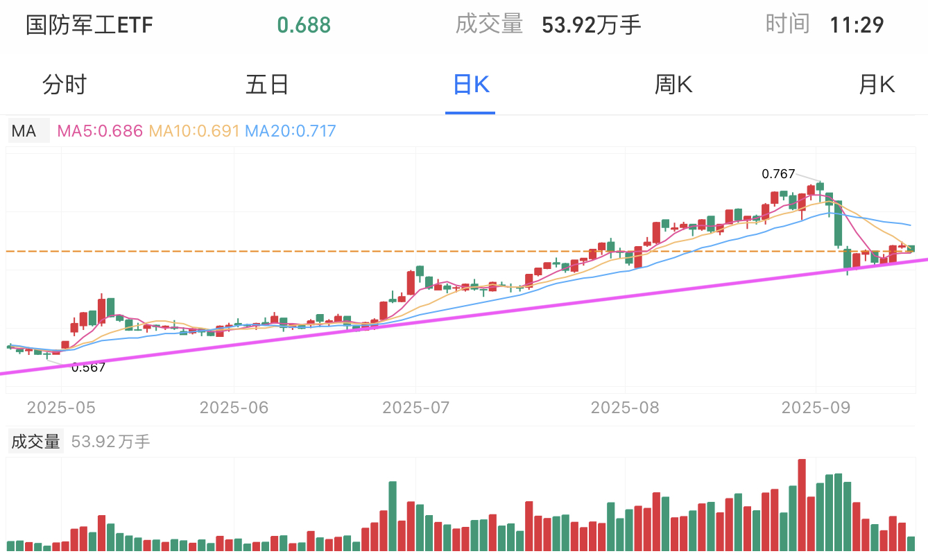 国防军工、稀土和金融科技近期有一波较大行情。最近力竭下跌,这几日在上涨趋势线反弹,有止跌迹象,但还不能确定回升,目前在支撑位震荡。