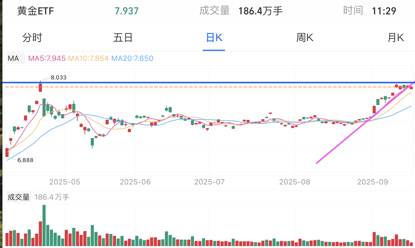 黄金ETF此前长期横盘震荡,最近反弹,有回升迹象。目前刚好涨至压力位,突破才能打开上行通道。这几日一直在压力位附近震荡。突破压力位才能打开上行通道,不知道震荡多久,本人重仓,虽只有少量收益,今日也先卖出一半仓位,等突破再回。非投资建议。