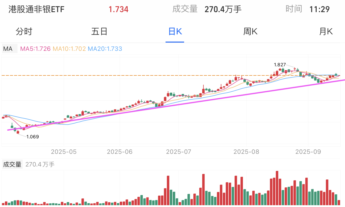 港股通非银金融类板块此前一直震荡上行,后力竭回调。最近几日再次反弹,有止跌迹象,但涨幅不大,还不确定就此回升还是陷入横盘整理。