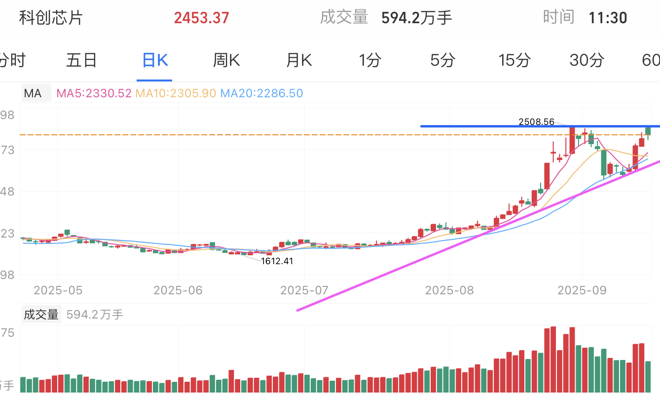 科创芯片近期有一波大行情,后力竭回调,这几日大幅波动。目前在上涨趋势线和最高点压力位之间震荡,后市方向不明。