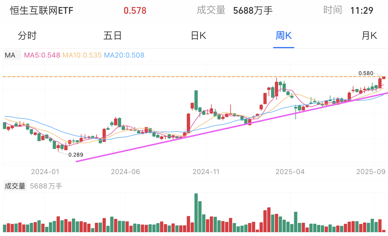 恒生互联网中长期为震荡上行,最近一直处于盘整期,这几日大幅反弹,终于突破关键压力位,如果确定突破,那么新行情开启。只是从周线看,交易量略显不足。