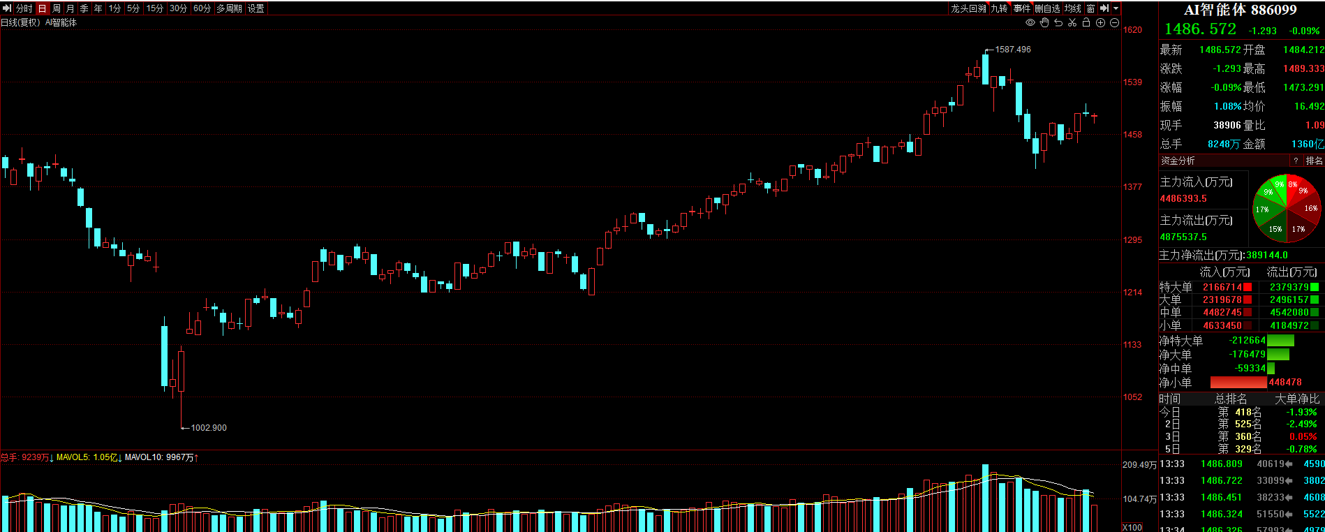 AI智能体窄幅震荡,短期行情在5日和20日均线区间震荡,我相信行情迟早会向上突破,所以我会继续格局等待。考虑到前期我在这个板块上已经属于重仓,所以暂时就不加了,等突破以后再去考虑。