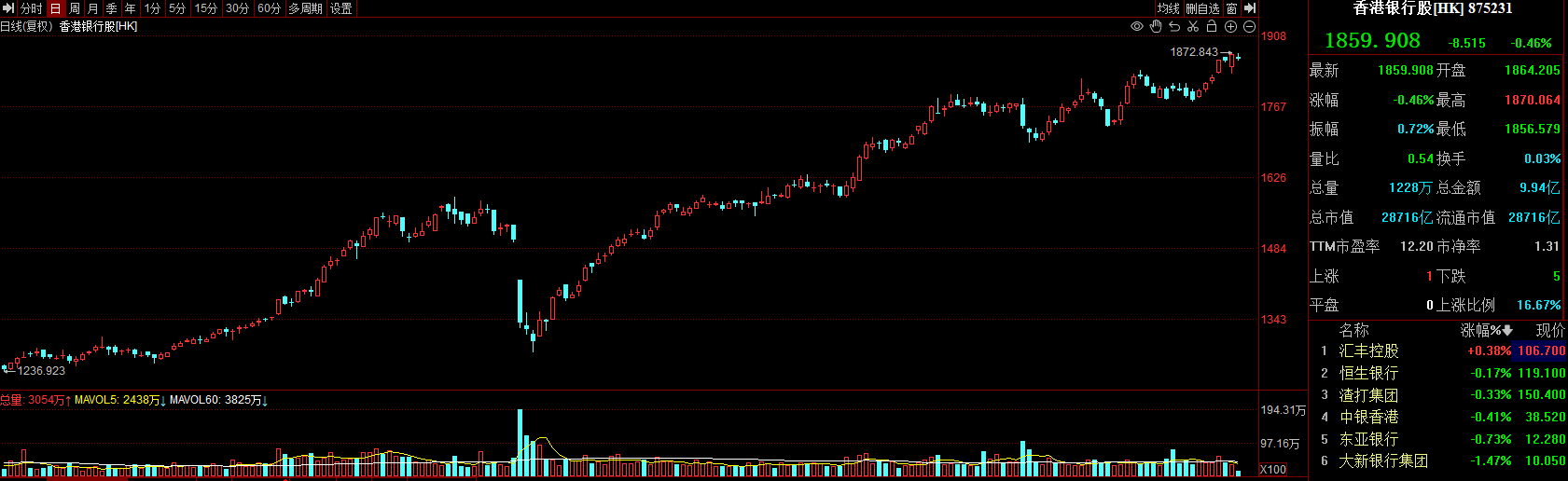 香港银行股高位窄幅震荡,继续关注5日均线的支撑,回踩支撑位置找机会继续做加法。